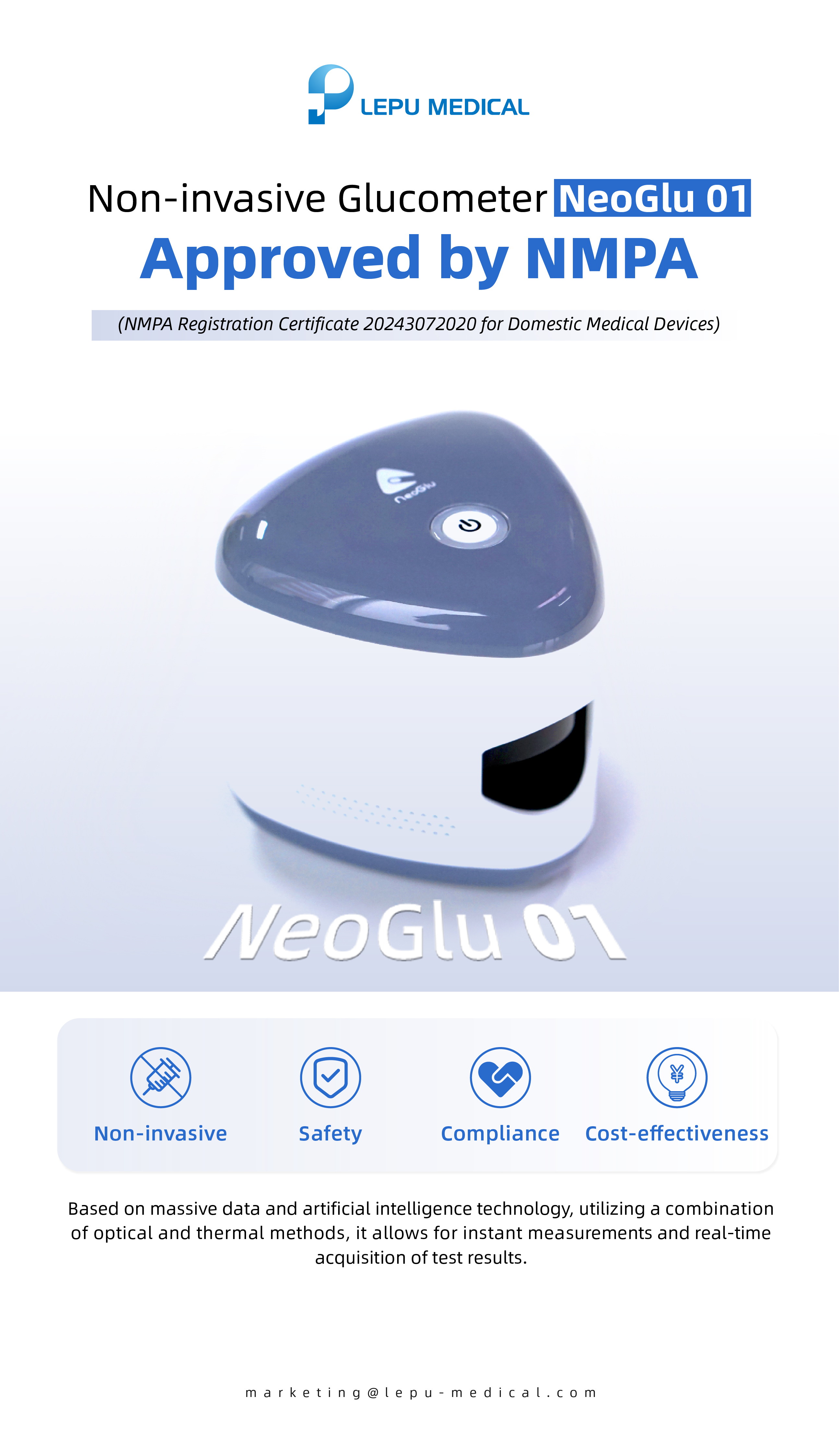 Recently, LEPU’s self-developed non-invasive glucometer(NeoGlu 01) has officially received registration approval from the National Medical Products Administration (NMPA), with the medical device registration certificate number: NMPA Registration No. 20243072020.
